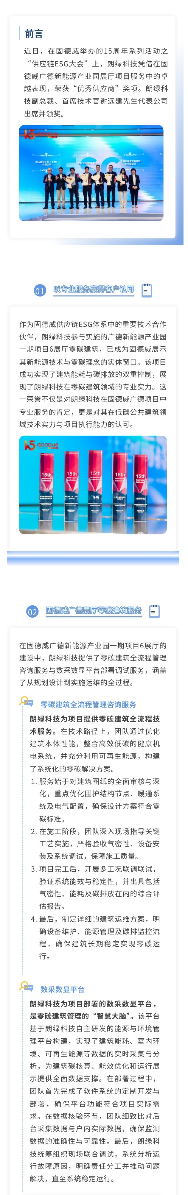 11月7日,在固德威舉辦的15周年系列活動之“供應鏈ESG大會”上,朗綠科技憑借在固德威廣德新能源產(chǎn)業(yè)園展廳項目服務中的卓越表現(xiàn),榮獲“優(yōu)秀供應商”獎項。朗綠科技副總裁、首席技術官謝遠建先生代表公司出席并領獎。