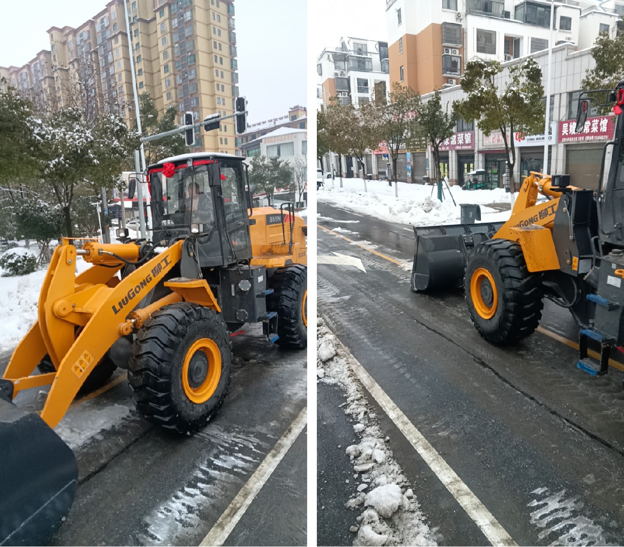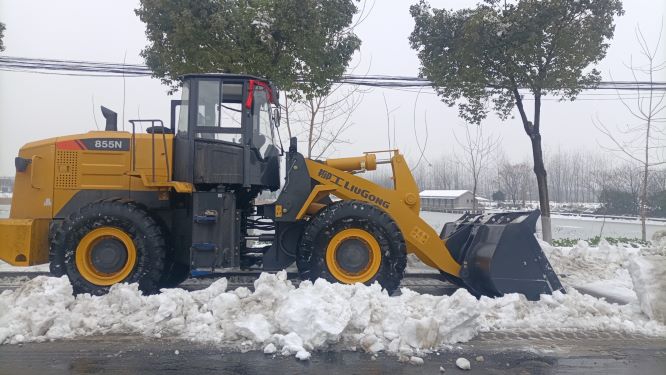 湖北武漢市的“破冰除雪”行動中,湖北柳瑞快速響應,提前部署,對裝載機、平地機等應急設備進行養護,準備了充足的備用品;出動柳工820H、856H以及855N裝載機參與市區除雪除冰。在武漢市部分街道和孝感市高速公路上,可以看到柳工855N、856N裝載機和滑移裝載機、平地機等設備忙碌的身影,它們在道路上忙碌除雪,確保道路暢通;吊裝融雪劑,降低冰雪對道路影響。