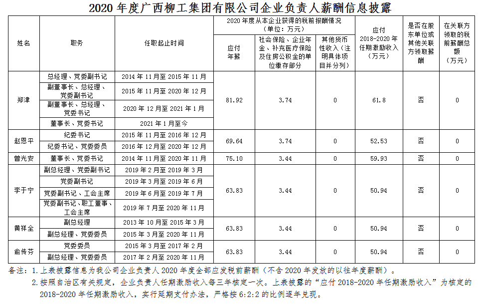 2020年度廣西柳工集團有限公司企業(yè)負責人薪酬信息披露