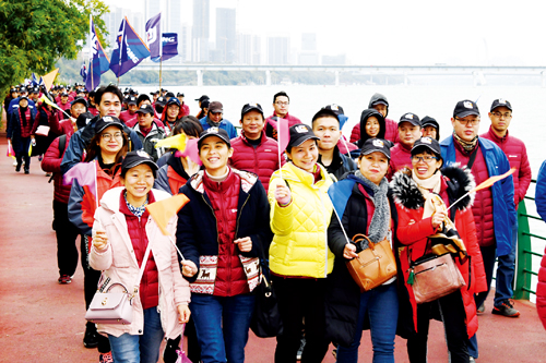 隨著曾光安的一聲啟動(dòng)號(hào)令,23個(gè)基層單位代表隊(duì)整齊有序地從起點(diǎn)出發(fā)。徒步中,天空飄起了蒙蒙細(xì)雨,接近冰凍的天氣讓大家不禁在寒風(fēng)中瑟瑟發(fā)抖,但腳下的步伐卻卻絲毫沒有減慢,沿著濱水大道邊聊邊走,感受著沿途的美麗風(fēng)景、分享著共同迎接新年的喜悅。“這樣的天氣能有這么多人,很熱鬧,讓人很有干勁。”來(lái)自集司機(jī)關(guān)的董先生說(shuō),“舉辦這次活動(dòng)一方面是讓大家從繁忙的工作生活中釋放出來(lái),強(qiáng)身健體;同時(shí),對(duì)參與者的意志品質(zhì)也是一種鍛煉。”
