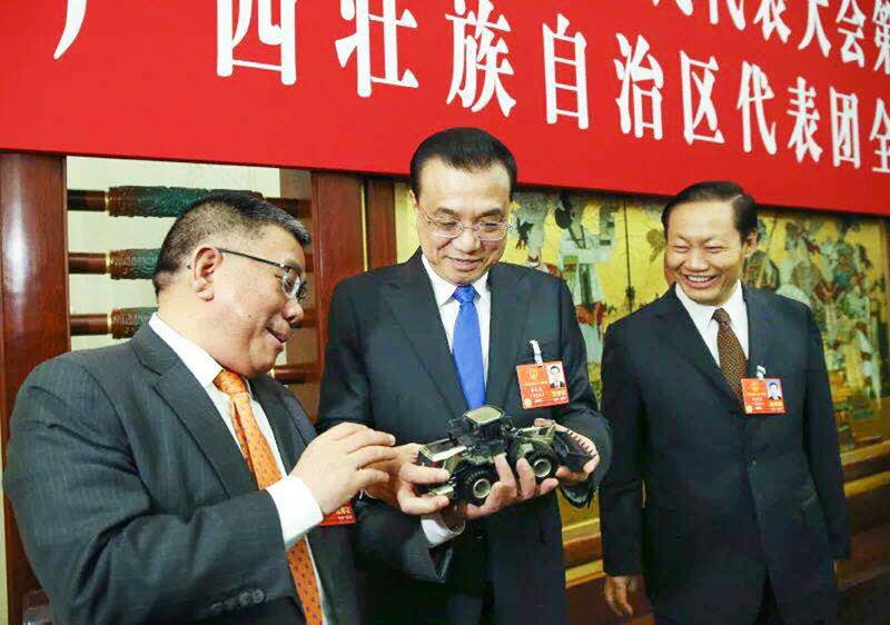 3月6日上午,李克強(qiáng)參加他所在的第十三屆全國人大一次會議廣西代表團(tuán)的分組討論,共同審議政府工作報告。廣西團(tuán)各位代表就經(jīng)濟(jì)社會發(fā)展、對外開放、裝備制造升級、支持鄉(xiāng)村振興等問題先后發(fā)言,代表們還向李克強(qiáng)展示了扶貧進(jìn)展、企業(yè)創(chuàng)新的照片和工程機(jī)械產(chǎn)品模型。李克強(qiáng)指出,要鞏固發(fā)展向好勢頭,必須繼續(xù)依靠改革開放創(chuàng)新。廣西作為西部地區(qū)中唯一的沿海省份,區(qū)位優(yōu)勢明顯,發(fā)展?jié)摿薮蟆R獔远ú灰茢U(kuò)大對外開放,深度融入“一帶一路”建設(shè),深入實施創(chuàng)新驅(qū)動發(fā)展戰(zhàn)略,結(jié)合推進(jìn)“互聯(lián)網(wǎng)+”和“中國制造2025”,提升創(chuàng)新創(chuàng)業(yè)水平和質(zhì)量,大力弘揚工匠精神,推動建設(shè)制造強(qiáng)國,努力在搶占未來競爭制高點中贏得優(yōu)勢。